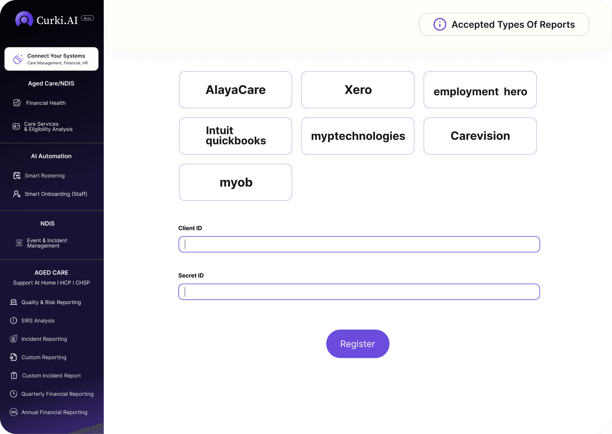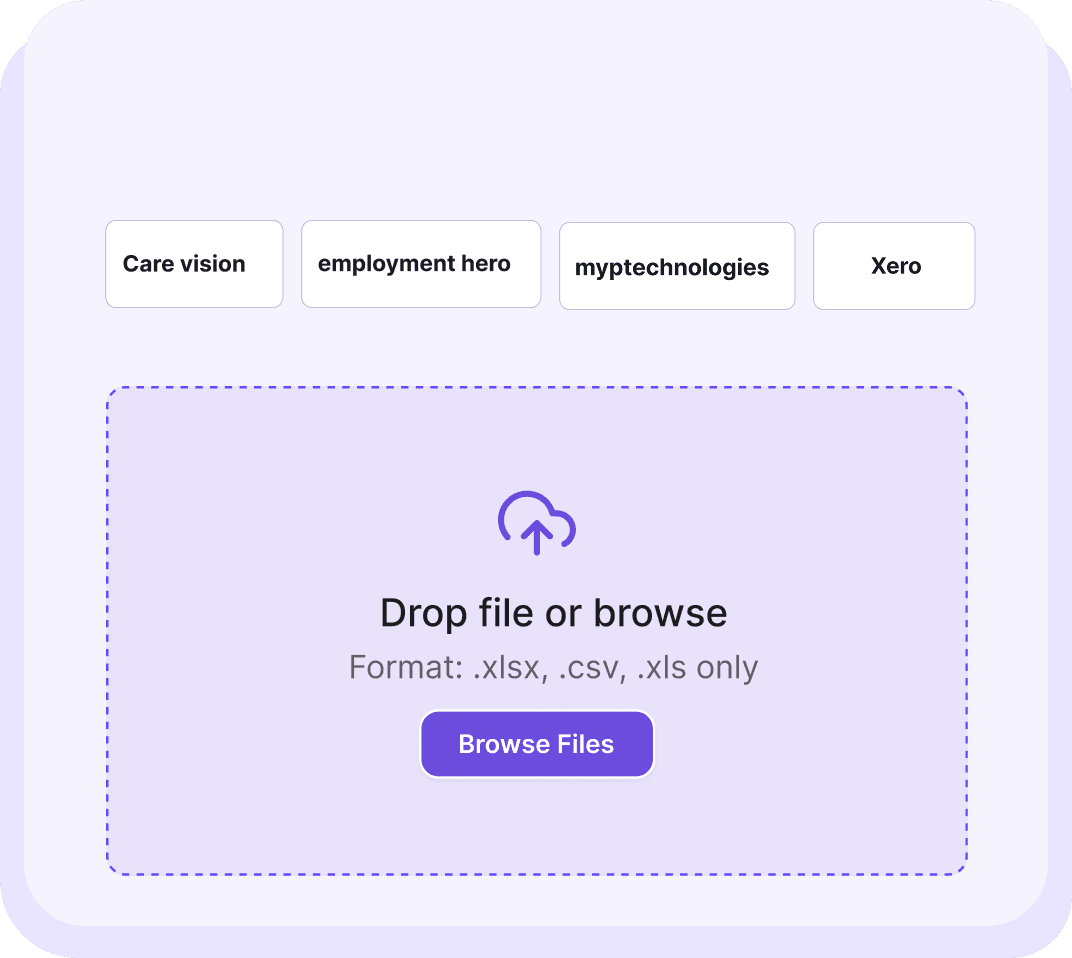 Curki.Ai works with what you already use simply upload reports or connect your aged care software to start seeing insights in minutes.