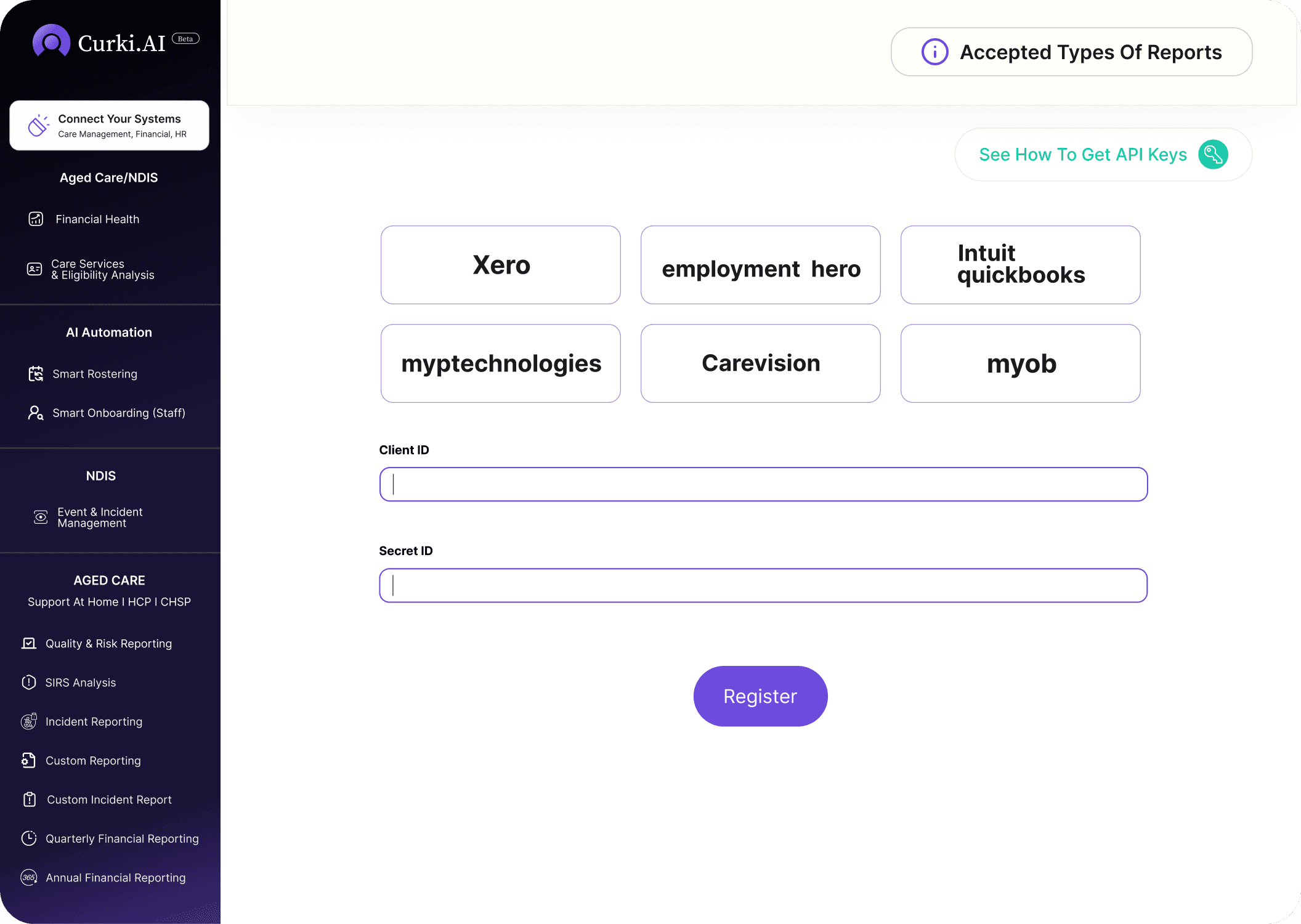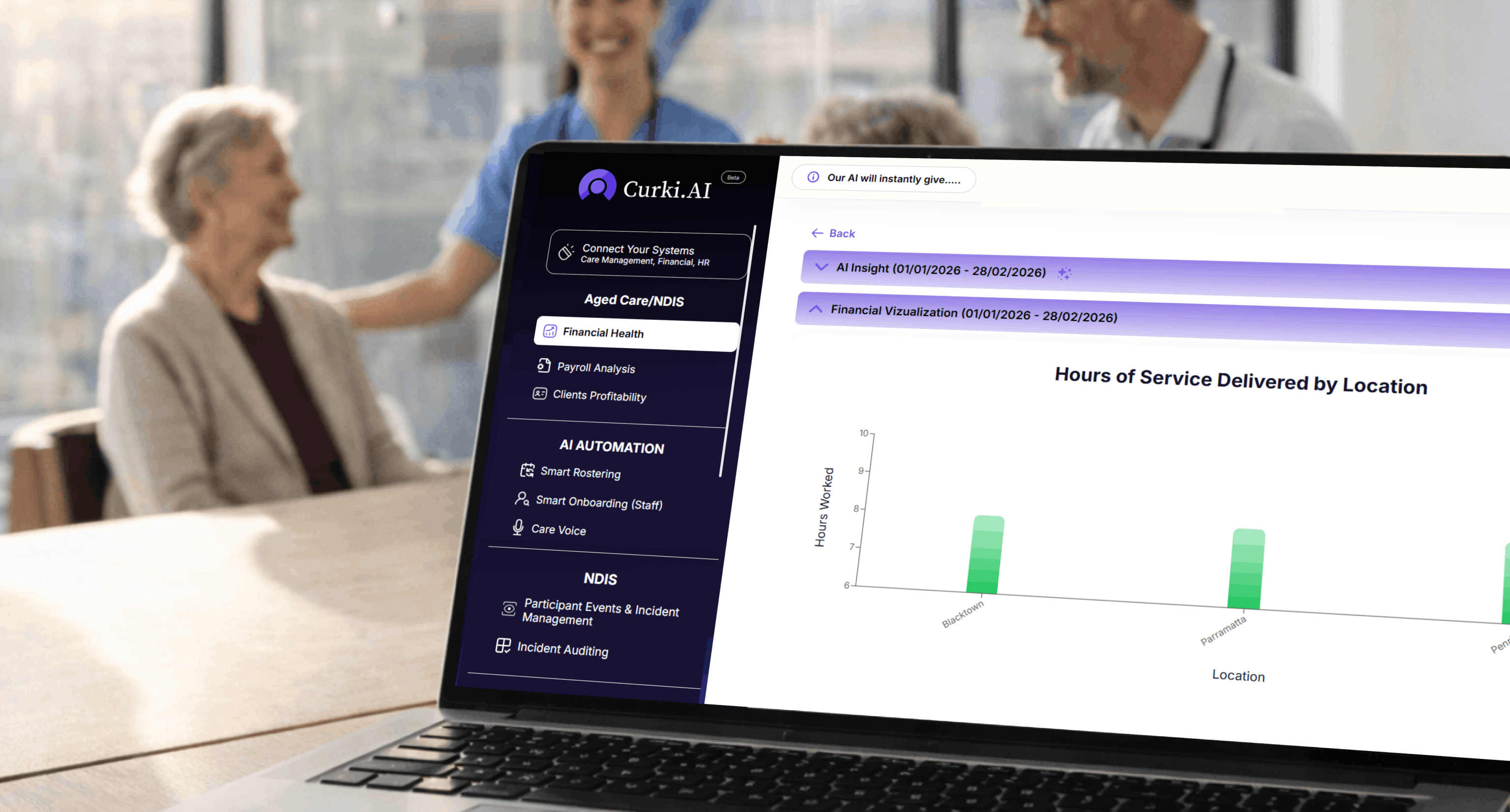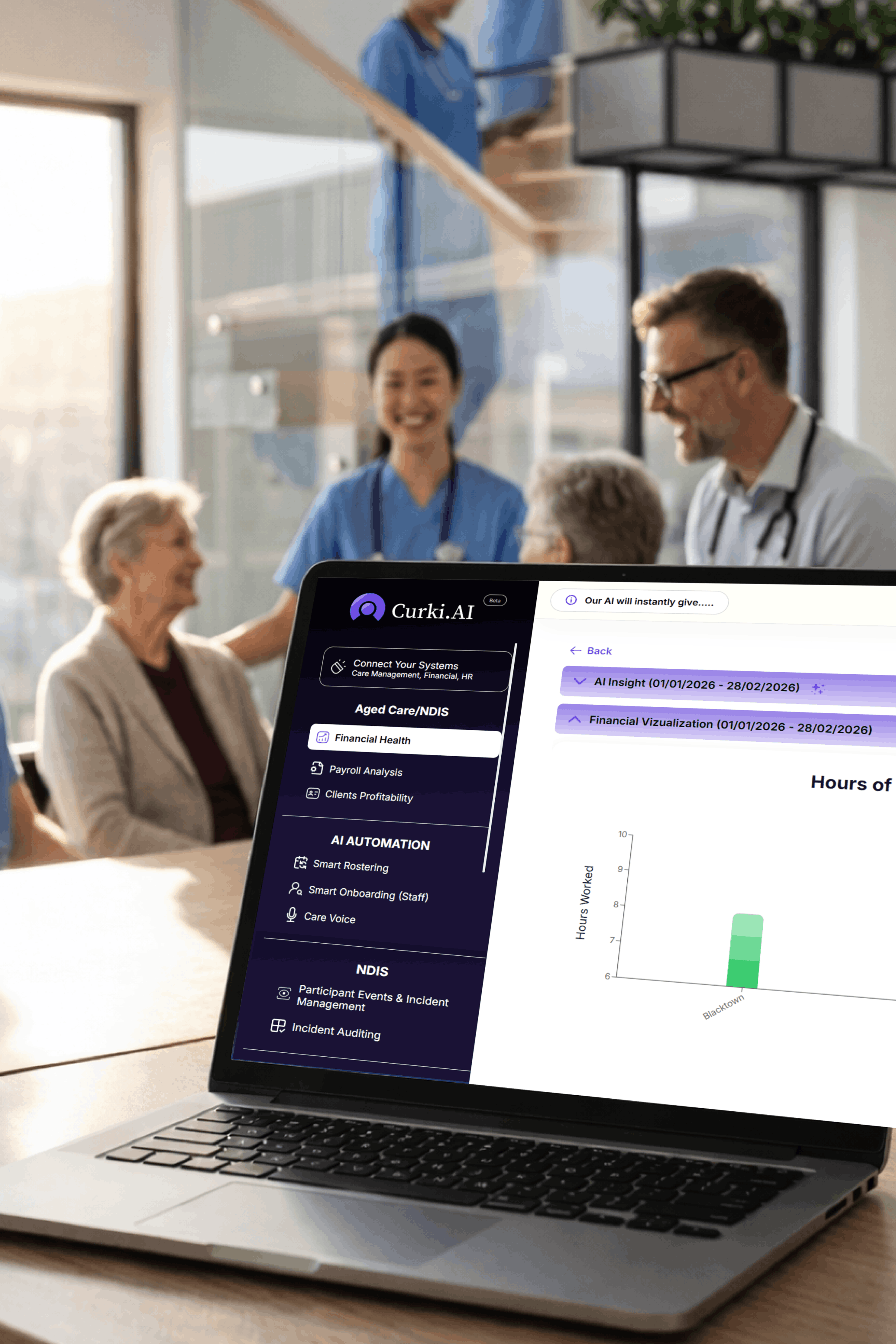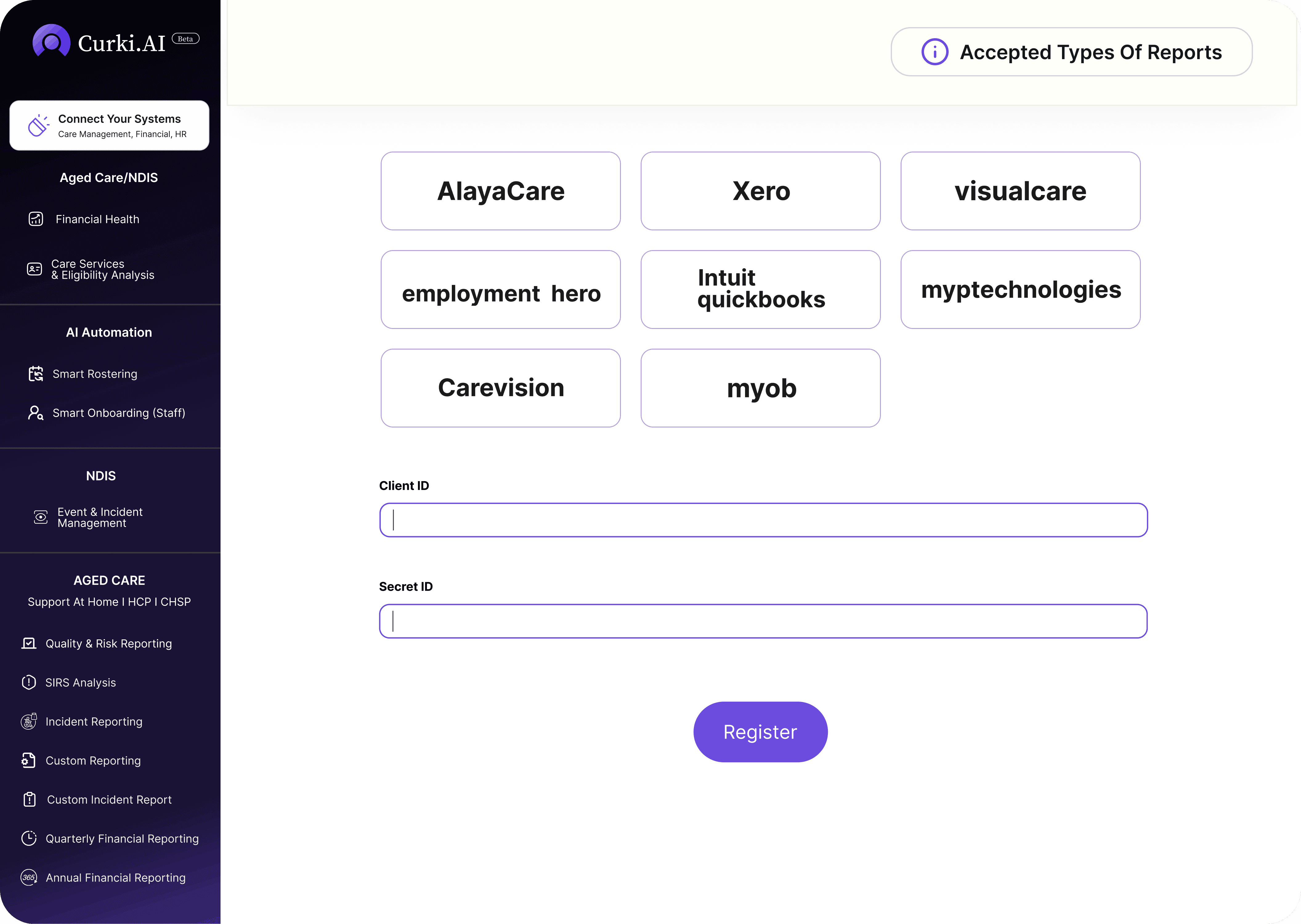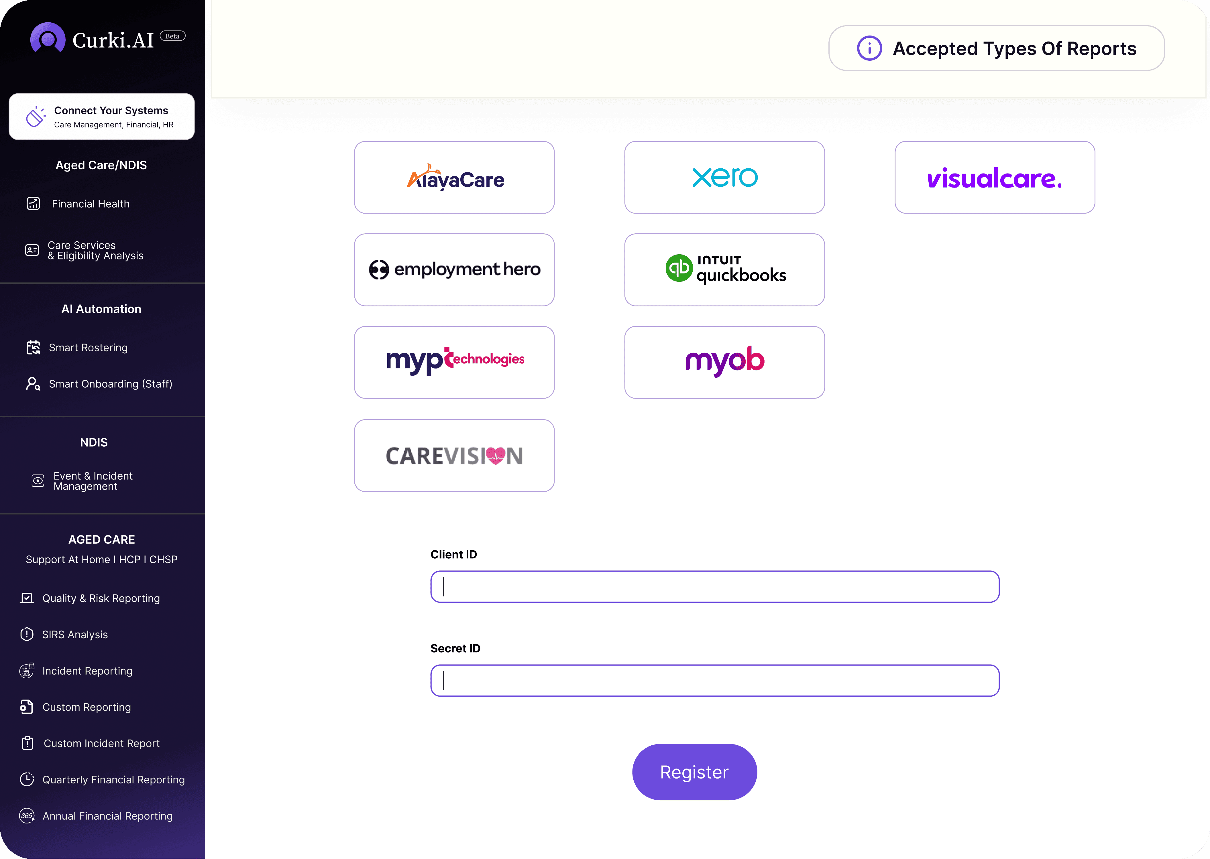 Curki.Ai works with what you already use simply upload reports or connect your aged care software to start seeing insights in minutes.